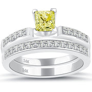 1.85 Carat Fancy Yellow Princess Cut Diamond Engagement Ring & Wedding Band Set
