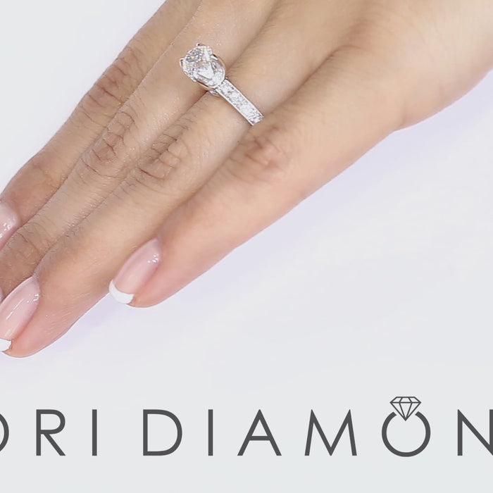 This vintage style diamond engagement ring is elegantly set with a 1.00 ctw D-SI3 certified round brilliant center diamond. The side diamonds of this mounting are F-VS princess cut diamonds set in a micro pave setting, and total 0.86 ctw. The center diamond is secured by four sturdy accompanying prongs. This beautiful round diamond engagement ring is crafted in 18k white gold.
