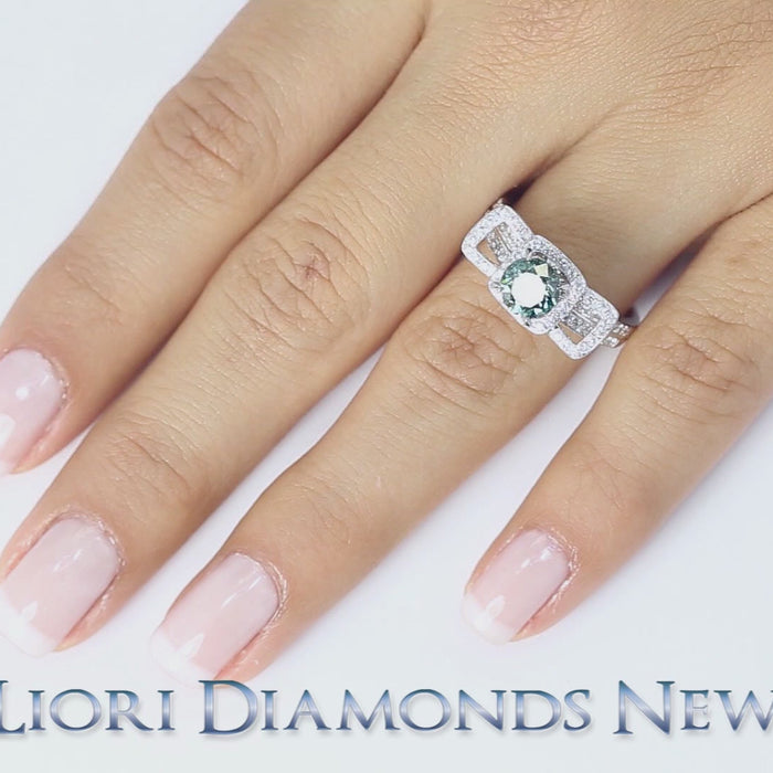 This faithful stylish ring is centered with a 1.11ctw SI2 Fancy Greenish Blue Diamond. It is set in a young fancy Micro Pave setting with Round Brilliant Diamonds of 0.78ctw F in color and VS in clarity. The diamonds fall along the side of the band, all around the center stone and on loops that give it a bow-like appearance. The main diamond is secured with 4 prongs and made in 18k white gold. This enchanting diamond engagement ring is a perfect fit for a young lady with a fancy sense of fashion.