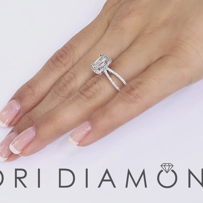 Give the love of your life an engagement ring that will leave her breathless. A glorious 1.21 ctw radiant cut diamond shines from the center of this setting. The brilliant center diamond is H-VS2 in color and clarity, and is held securely in place by 4 double prongs. Beautiful micro pave set round diamonds form an angelic halo around the main stone. More dazzling pave set diamonds line the feminine split shank band, and can even be found on the gallery of the piece. This spectacular diamond engagement ring is made in 18k white gold.