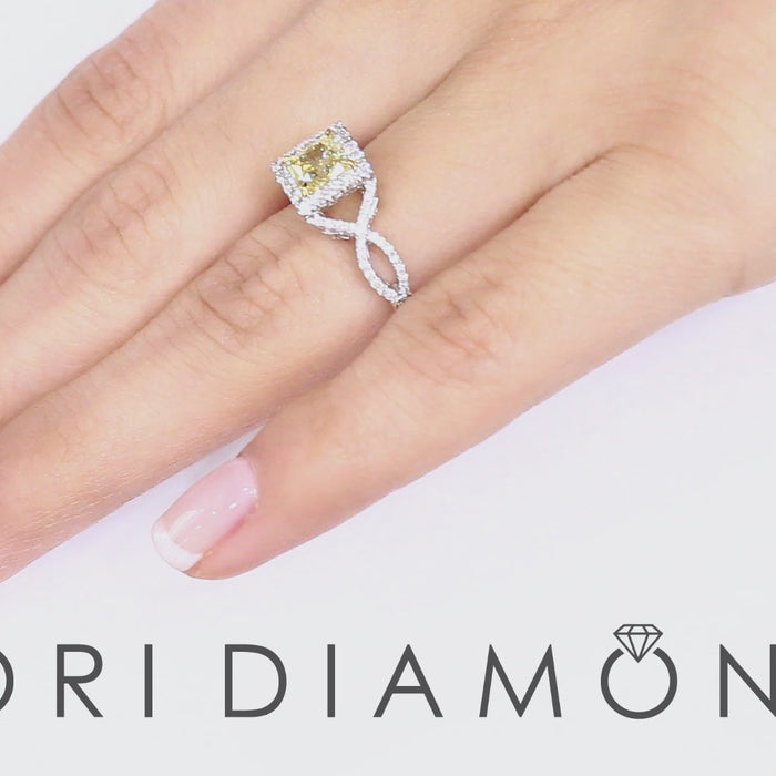 Gorgeously centered sits a 1.09ctw VS2 Fancy yellow Cushion cut diamond. the diamond is perfectly set up in a symmetrical engagement setting decorated with 0.85ctw F-VS Round diamonds. The modern yet vintage engagement ring is made in 18k white gold. Beautifully designed, the lady's ring is one of-of-a-kind.