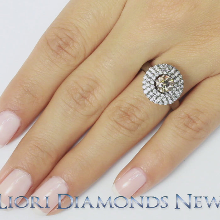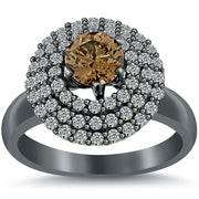 This beautiful diamond ring holds a 0.87 ctw Fancy Chocolate Brown round brilliant center diamond and is accompanied by 1.07 ctw of sparkly F-VS white round brilliant side diamonds. Three pave halos of white round brilliant diamonds are set around the fancy chocolate brown center diamond. The band of the ring is smooth and solid going all the way around. This fancy color diamond engagement ring is made in 14k black gold.