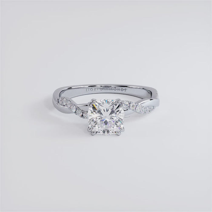 A petite diamond infinity twist engagement ring set with 1.00 Carat Cushion cut Lab Grown Diamond.