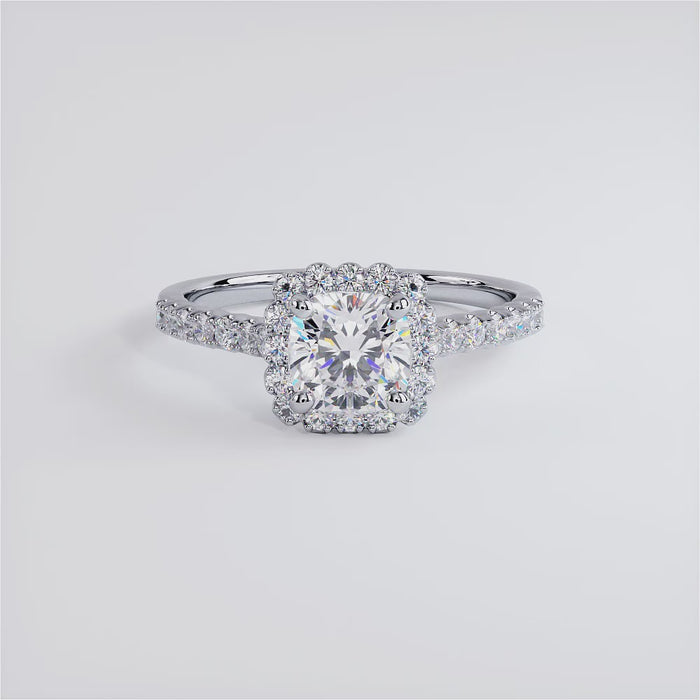 A beaded prong halo diamond engagement ring set with 1.00ct dew Cushion Cut VVS & Colorless (D-E-F) Moissanite.