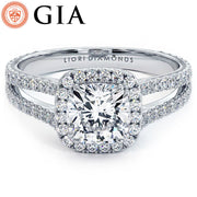 A halo split shank french cut diamond engagement ring set with 1.00 Carat Cushion Cut Lab Grown Diamond.