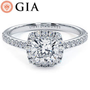 A micropavé halo engagement ring set with 1.00 Carat Cushion Cut Lab Grown Diamond.