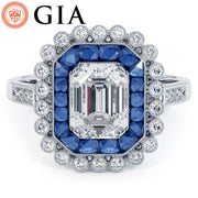 Hand made art deco special cut sapphire & diamond engagement ring set with 1.00 Carat Emerald Cut Lab Grown Diamond.