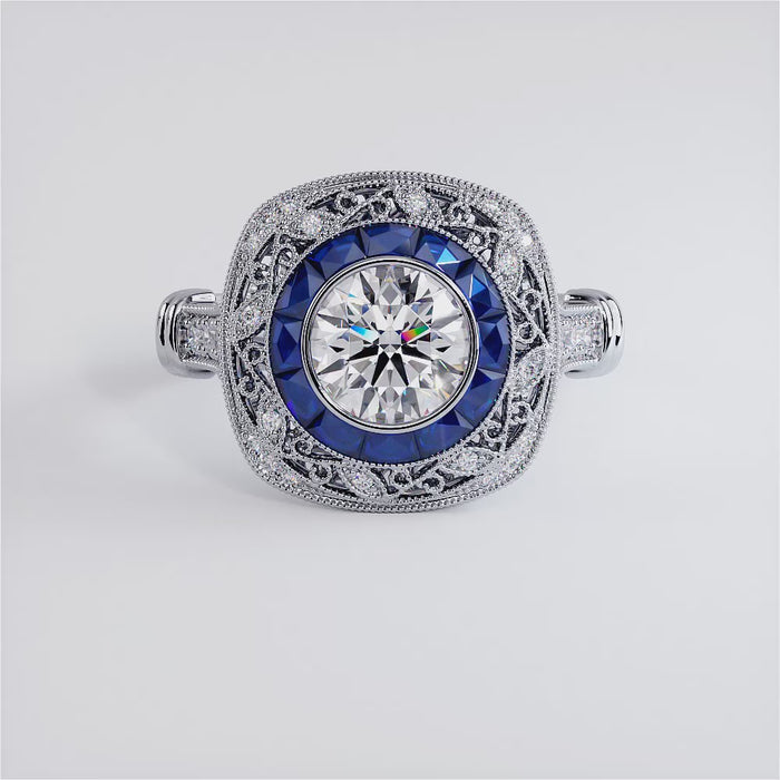 Hand made art deco special cut double sapphire halo & diamond engagement ring set with 1 Carat Round Cut Lab Grown Diamond.
