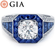 Hand made art deco special cut sapphire & diamond engagement ring set with 100% natural earth mined Diamond (not treated or enhanced in any way).