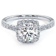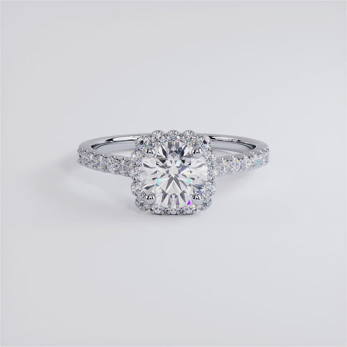 A beaded prong halo diamond engagement ring set with 1.00ct DEW Round Cut Charles & Colvard Forever One™ Colorless (D-E-F) Moissanite.