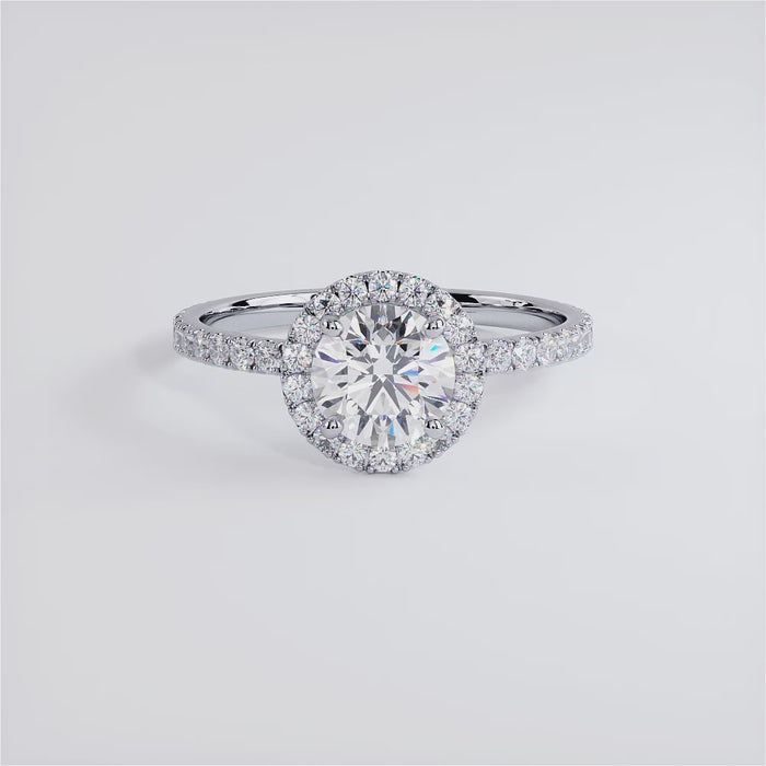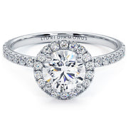 A petite halo micropavé diamond engagement ring set with 1.00ct dew Round cut VVS & Colorless (D-E-F) Moissanite.