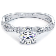 A petite diamond infinity twist engagement ring set with 1.00ct DEW Round Cut Charles &  VVS & Colvard (D-E-F) Moissanite.