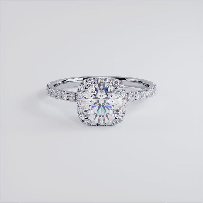 A petite squarish halo micropavé diamond engagement ring set with 1 Carat Round Cut Lab Grown Diamond.