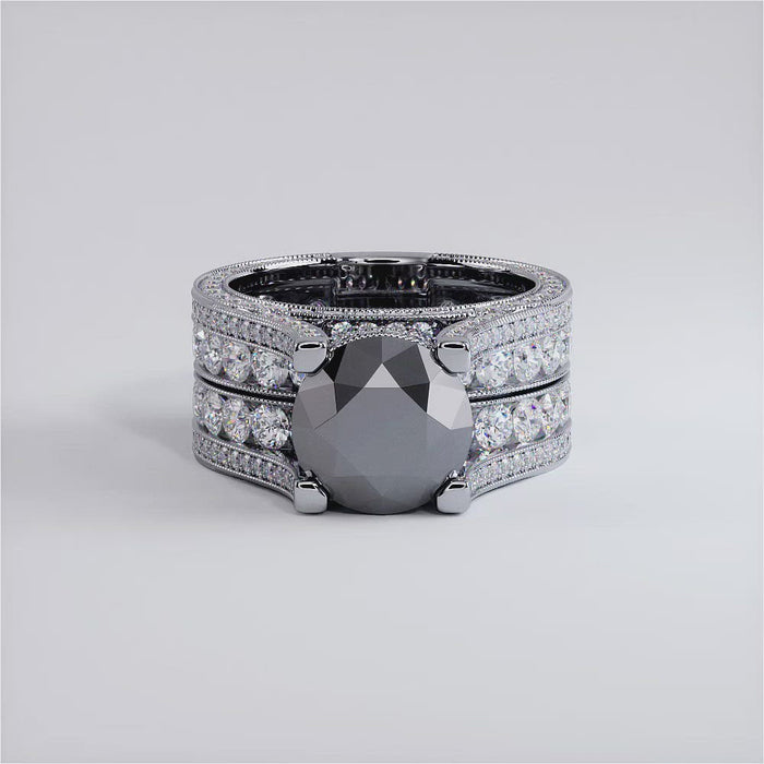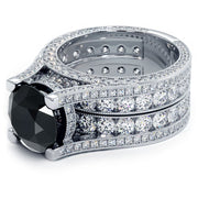 This huge black diamond engagement ring is perfectly set with a 6.68 ctw round cut black diamond and decorated with 5.89 ctw of round cut white diamonds. This is the perfect black diamond engagement ring for that woman who likes a big black diamond engagement ring. This very big black diamond engagement ring is full of sparkle.This black diamond ring can be worn on special occasions as well as everyday. All of these diamonds are perfectly set in 14k white gold.