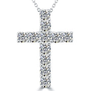 This fascinating diamond pendant is set with 2.00ctw of D-VVS round brilliant diamonds that are beautifully set to form a lustrous diamond cross. Each diamond dazzles and sparkles from every angle. All eleven diamonds are set and secured in a prong setting. This diamond cross pendant necklace is set in 14k white gold and comes with a 14k white gold chain.