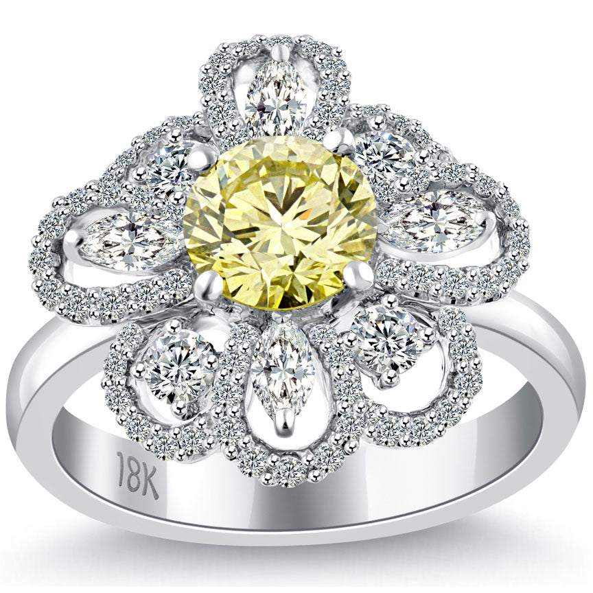 2.01 Carat Fancy Yellow Diamond Flower Shape Engagement Ring 18k White Gold