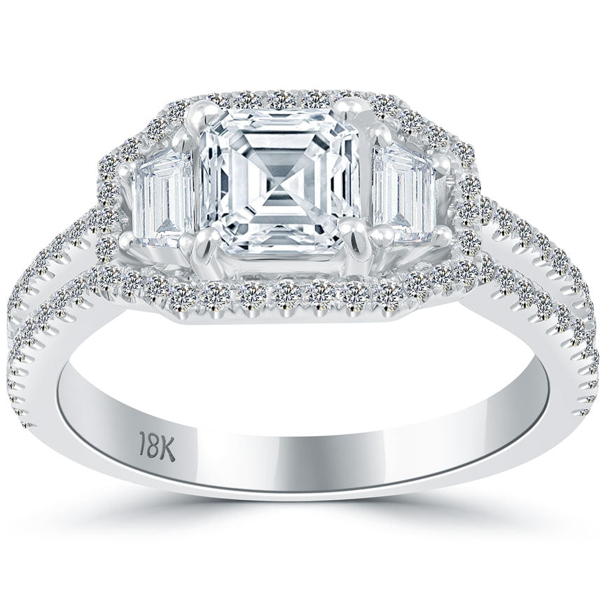 This sparkly diamond engagement ring is perfectly set up with a 1.12ctw asscher cut center diamond and 0.90ctw of F-VS gorgeous round brilliant and baguette cut side diamonds. One baguette cut diamond is set on either side of the center stone. The asscher cut center diamond and the accompanying baguettes are all set in a prong setting. Round brilliant side diamonds are set along the band as well as the face of this ring, in a pave halo design. This vintage style diamond engagement ring is made in 18k white gold.