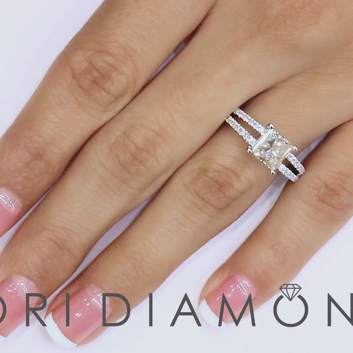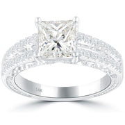 A princess cut diamond engagement ring for your queen-to-be! An alluring 1.53 ctw princess cut diamond of L color and SI2 clarity centers this piece. Sparkling F-VS micro pave set round diamonds line the unique split shank band and the gallery features intricate scroll work for added detail. This stunning vintage style diamond engagement ring is made in 14k white gold.