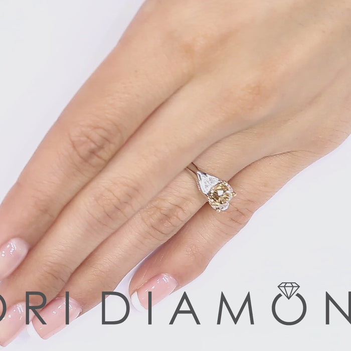 This gorgeous three stone engagement ring consists of a 1.59 ctw cushion cut center fancy champagne brown diamond with a trillion cut white diamond on either side. The white diamonds are F-VS1 in color and clarity, and total 0.44 ctw. The white gold band is smooth and solid going all the way around. The center diamond is slightly raised above the two side stones to stand out and give it more diversity. All three stones are secured with a prong setting. This ring is made in 14k white gold.