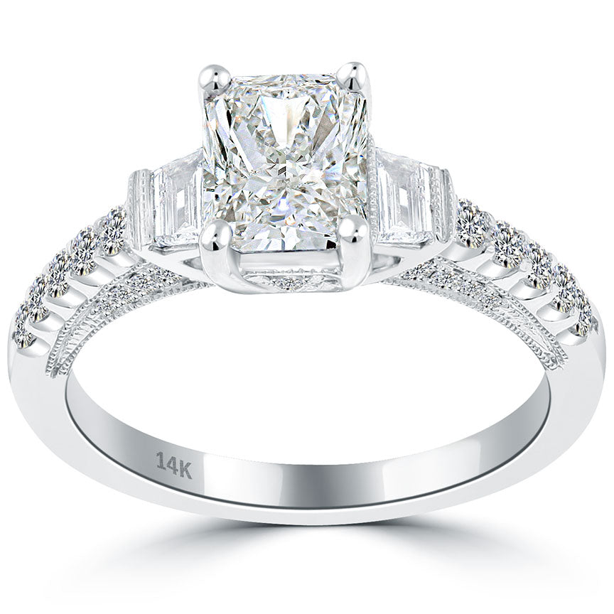 This fascinating diamond engagement ring is set with a dazzling 1.39 ctw radiant cut center diamond. Both round brilliant and baguette cut diamonds are used as side diamonds in this engagement ring, and are set along the elegant band on either side of the center diamond. This radiant cut diamond engagement ring is made in 14k white gold.