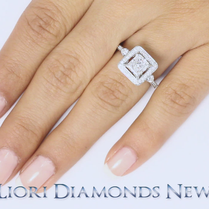 This fascinating diamond engagement ring is set with a 1.34ctw radiant cut center diamond. 0.71 ctw of F-VS round brilliant diamonds are set as side diamonds in this beautiful engagement ring. The radiant cut center diamond is set in a prong setting. The round side diamonds surround the center diamond in a pave halo design. More round diamonds are set along the elegant band of the ring. This radiant cut diamond engagement ring is made in 14k white gold.