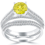 2.05 Carat Fancy Yellow Round Cut Diamond Engagement Ring & Wedding Band Set 18k