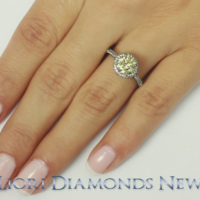 This elegant and unique fancy color diamond engagement ring is beautifully set with a 1.51ctw fancy chocolate brown round brilliant center diamond. 0.55ctw of white F-VS round brilliant diamonds are the side stones used in this mounting. White round diamonds are set along the band of this ring as well as around the center diamond, in a pave halo design. This fancy color round diamond engagement ring is made in 18k black gold.