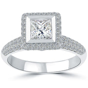 This classy Ladies Diamond Engagement Ring accommodates a 1.02ctw Princess Cut center diamond and 1.05 ctw of F-VS round brilliant side diamonds. Two rows of round diamonds are set all around the princess cut center diamond, in a pave halo design. Three rows of micro pave diamonds is set on either side of the band, going half way down the ring. The princess cut center diamond is set in a bezel setting. This Princess Cut Diamond Engagement Ring is made in 18k White Gold.
