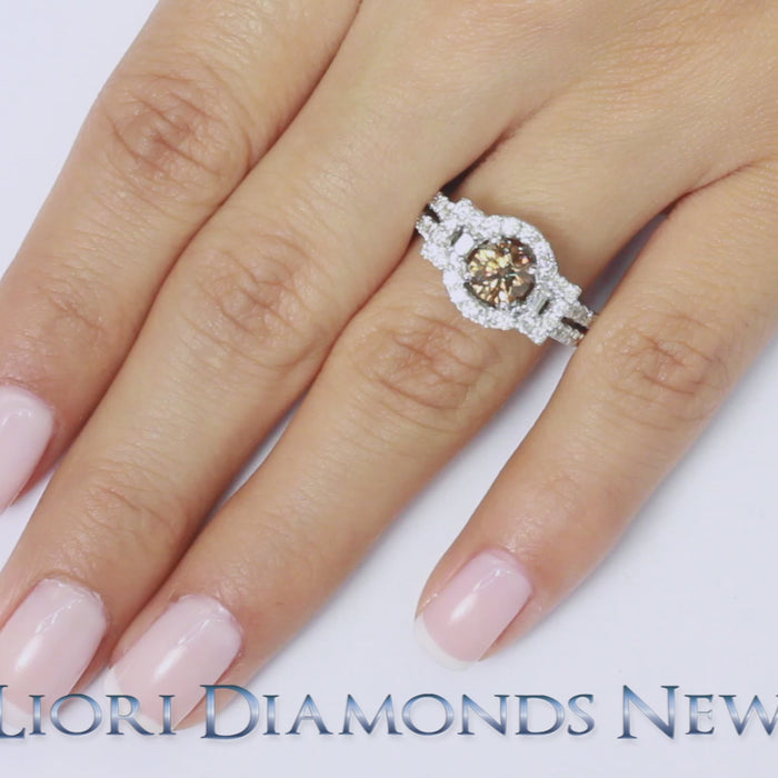 This one of a kind fancy color diamond engagement ring is set elegantly with a 0.99ctw Fancy Chocolate round brilliant center diamond. Both baguette cut and round brilliant white diamonds are used as side stones in this mounting. One baguette cut diamond is set on either side of the center stone, white white diamonds surrounding in a pave halo design. All of the side diamonds are secured in a micro pave setting. This fancy chocolate round diamond engagement ring is made in 14k white gold.