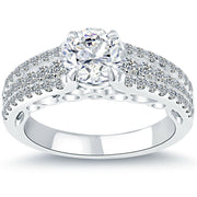 This elegant diamond engagement ring is set with a 1.25 ctw E-SI1 round brilliant center diamond. The side diamonds of this engagement are all F-VS round brilliant diamonds. The center diamond is secured in a prong setting and the side diamonds are all set in a micro pave setting. This diamond engagement ring is made in 14k white gold.