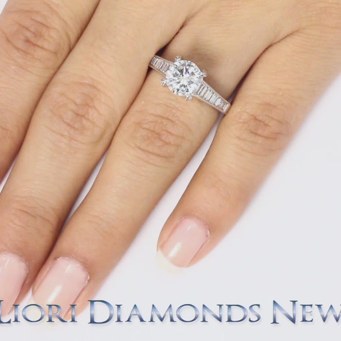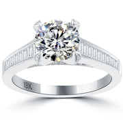 This fascinating diamond engagement ring is a true beauty designed with a unique vintage style. The center stone of this diamond engagement ring is a ravishing 1.55ctw round brilliant diamond. Both baguette cut and round brilliant F-VS diamonds are used as side stones in this mounting. This round diamond engagement ring is made in 18k white gold.