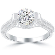 This elegant diamond engagement ring can be yours today! A colorless 1.50 ctw round brilliant diamond centers this vintage inspired setting, and is rated in E in color, SI3 in clarity. 0.60 ctw of vibrant micro pave set diamonds line the band and basket. Set lavishly in 18k white gold, this piece is sure to be a gift that will be held close to the heart forever.