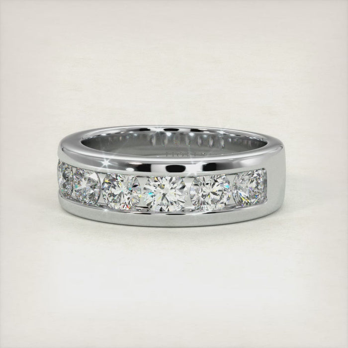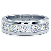 This stylish men's wedding band is beautifully set with 3.00ctw of round brilliant diamonds. There are a total of seven round brilliant diamonds that are all set in a channel setting. This men's diamond wedding band is made in 14k white gold.