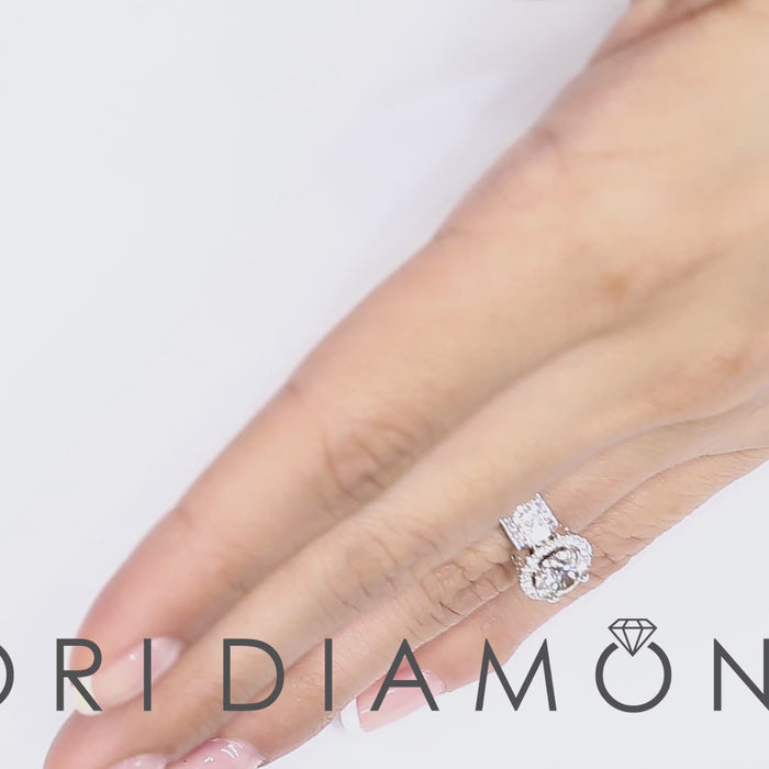 This outstanding engagement ring is set with a sparkling 1.19 ctw G-SI1 round brilliant center diamond. An abundance of micro pave set diamonds surround the fiery center diamond in a pave halo design. Vibrant princess cut diamonds are set on either side of the larger diamond. To add even more sparkle, pave set diamonds are set to the top & bottom of the princess cut diamonds as well. All of the side stones in this ring are F-VS in color and clarity, and total 0.95 ctw. Cast in luxurious 18k white gold, this diamond engagement ring will be a gift that will not soon be forgotten!