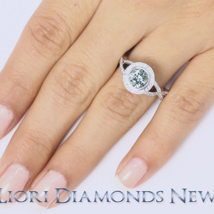 This astonishing diamond ring holds a 1.51 ctw Fancy Blue round brilliant center diamond and 0.68 ctw of white side diamonds. The center diamond is secured in a bezel setting. The band of this ring has a criss-cross design that is lined with small round brilliant diamonds. A halo of small round diamonds surrounds the center diamond. All of the side diamonds are secured in a micro pave setting. This engagement ring is made in 18kt White Gold.