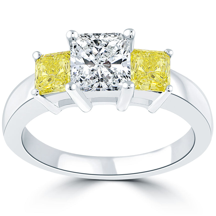 2.19 Carat Fancy Yellow & White Radiant Cut Three Stone Diamond Engagement Ring
