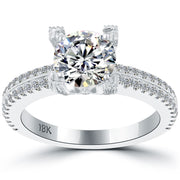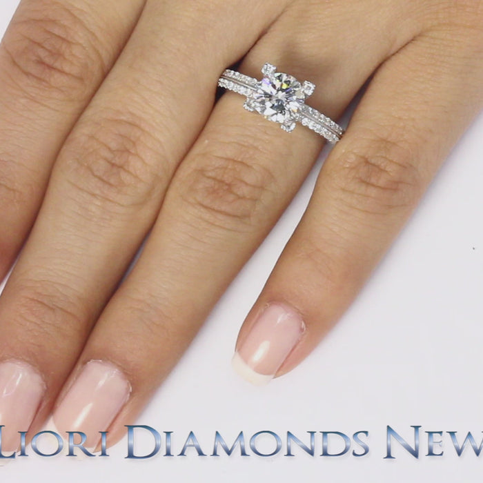This beautiful and traditional diamond engagement ring is truly elegant. This classy engagement ring is set with a 1.68ctw round brilliant center diamond and 0.55ctw of F-VS round brilliant side diamonds. The center diamond is secured in a prong setting and all of the side diamonds are set in a micro pave setting. This is the ultimate ring for your modest and elegant bride and it is made in 18k white gold.