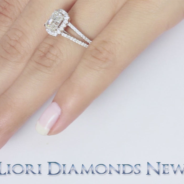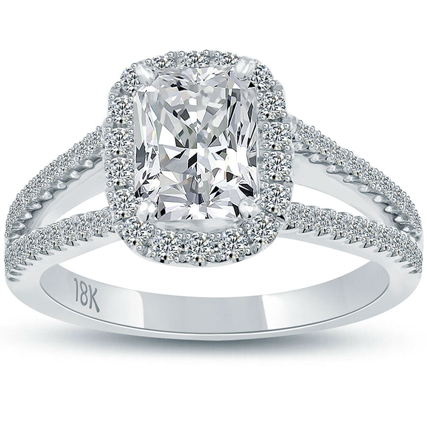 This fascinating diamond ring is set with a 1.52 ctw H-VS2 Radiant Cut center diamond. This ring is accompanied by 0.72cts TW round side diamonds. The small round diamonds surround the center stone in a single row. This ring has a split shank band that is lined with small round diamonds as well. This ring is made in 18kt white gold.