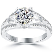 This classy round diamond engagement ring is beautifully styled with a vintage style design. The center diamond is a beautiful 1.61ctw round brilliant diamond. 0.65 ctw of smaller round brilliant diamonds are set along the split shank band. The center diamond is secured in a prong setting. All of the side diamonds are set in a micro pave setting. This gorgeous round diamond engagement ring is made in 18k white gold.