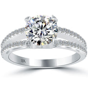 This elegant, classy and traditional round diamond engagement ring is set perfectly with a 1.58ctw round brilliant center diamond that is accompanied by 0.68ctw of F-VS round brilliant side diamonds. The center diamond is secured in a prong setting. Two rows of round brilliant side diamonds are set beautifully along the elegant split shank band of this ring. More round side diamonds are set along the four prongs that hold the center diamond. All of the side diamonds are secured in a micro pave setting. This round diamond engagement ring is made in 18k white gold.