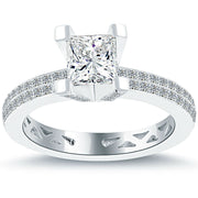 This sensational diamond ring holds a 1.16 ctw H-VS1 Princess Cut center diamond. The side stones are all F-VS round brilliant diamonds. Two rows of round diamonds are set along either side of the band, going half way down the ring. The center stone is secured in a prong setting, all four prongs lined with round diamonds as well. This ring is made in 14kt White Gold.