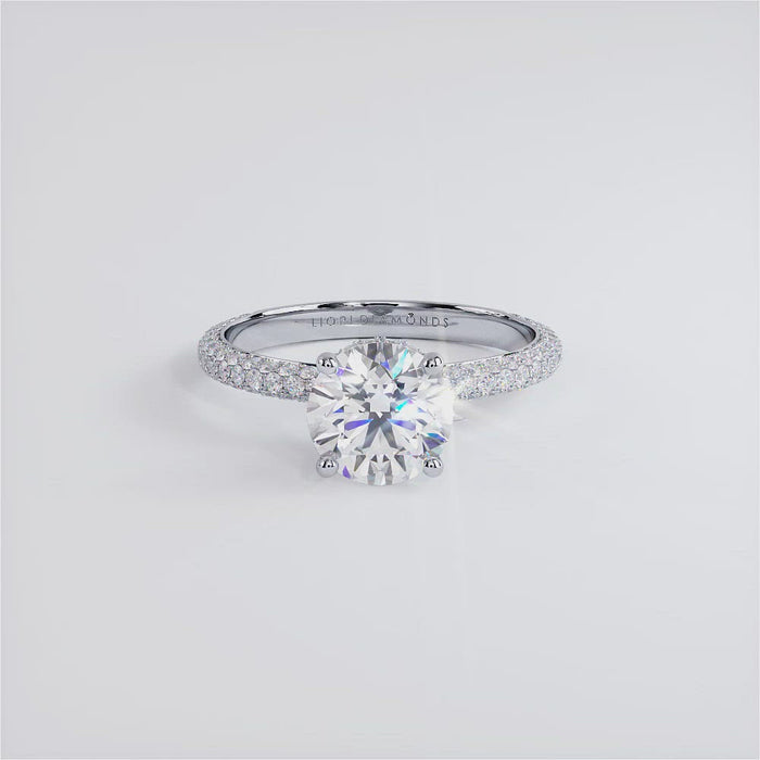 A classic under halo trio micropave diamond solitaire engagement ring set with 1.50 Carat Round Cut Lab Grown Diamond, securely held in place by four sturdy prongs.