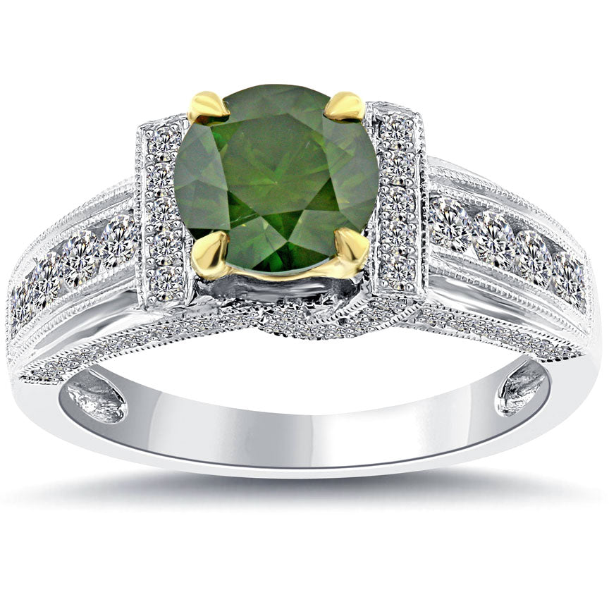 This brilliant 1.51ct TW round cut green diamond is set in an antique setting perfectly decorated with 0.80cts TW of side diamonds. This green antique diamond engagement ring is a perfect diamond ring for any occasion. Set in 14kt white gold this ring is a beautiful antique diamond engagement ring and ready to be worn by that special person in your life.