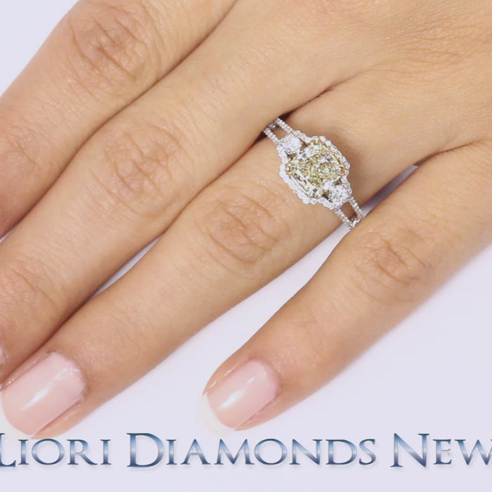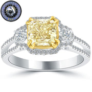 This ravishing fancy color diamond engagement ring features a dazzling 1.50ctw natural fancy yellow radiant cut center diamond. The side diamonds in this vintage style mounting are all F-VS round brilliant white diamonds. Two slightly larger white round diamonds are set by the center diamond, one on each side. All three of the main diamonds are secured in a prong setting. The center diamond is set in a yellow gold base and is secured by yellow gold prongs, which further enhance the beauty of the fancy yellow radiant cut center diamond. Smaller white round brilliant diamonds surround the three main stones in a pave halo design and are set along the split shank band of this ring in a micro pave setting. This fancy yellow diamond engagement ring is made in 14k white and yellow gold.