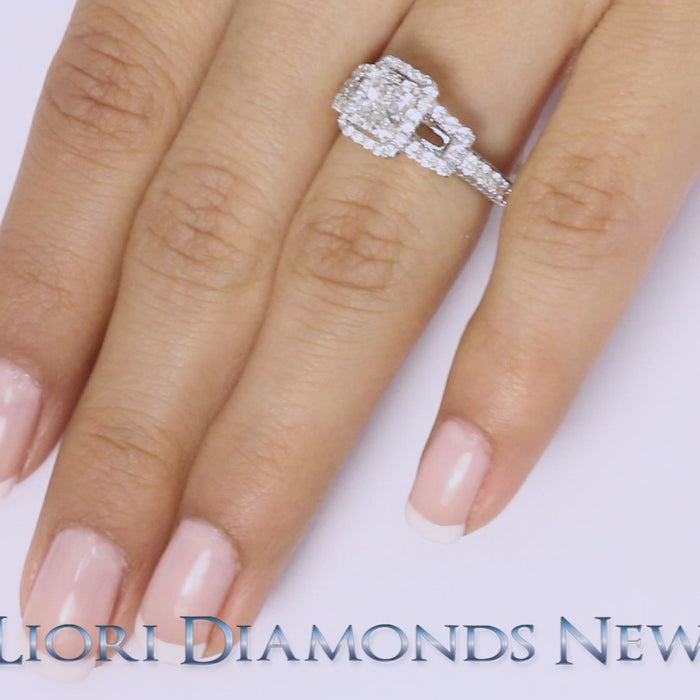 This gorgeous one of a kind diamond engagement ring is set beautifully with a 1.14ctw radiant cut center diamond. 1.21 ctw of F-VS round brilliant side diamonds are set in a micro pave setting on this mounting. Round side diamonds are set surrounding the center diamond in a pave halo design. The center diamond is secured in a prong setting. This radiant cut diamond engagement ring is made in 18k white gold.