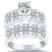 This one of a kind diamond engagement ring is perfectly set up with a 0.82 ctw round brilliant diamond center stone. 1.55 ctw of F-VS round brilliant and baguette cut diamonds are set as side diamonds in this engagement bridal set. This unique diamond engagement ring is accompanied by a beautiful matching diamond band creating a gorgeous bridal wedding set. This diamond bridal set is made in 14k White Gold.