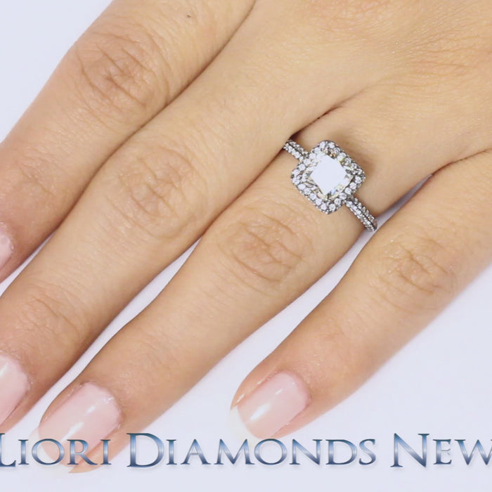 This ladies diamond ring is made with 1.75 ctw Fancy Champagne Cushion Cut center diamond and 0.64 ctw of beautiful side diamonds. Two rows of micro pave diamonds are set around the center diamond. Two rows of micro pave diamonds line up either side of the band and going three quarters down the ring. The center diamond is secured with a prong setting and the side diamonds are set in a micro pave setting. This diamond ring is made in 18kt Black Gold.