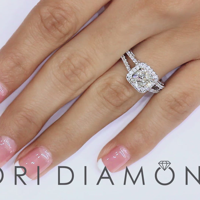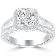 This diamond engagement ring features a stunning 1.80 ctw cushion cut center diamond of G color and SI1 clarity. The brilliant main diamond is surrounded by a glittering halo of micro pave set diamonds, which also line the stylish split shank band. All of the side diamonds total 0.60 ctw and are F-VS in color and clarity. Classy and elegant, this vintage style diamond engagement ring is made in 18k white gold.