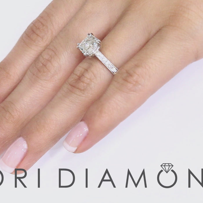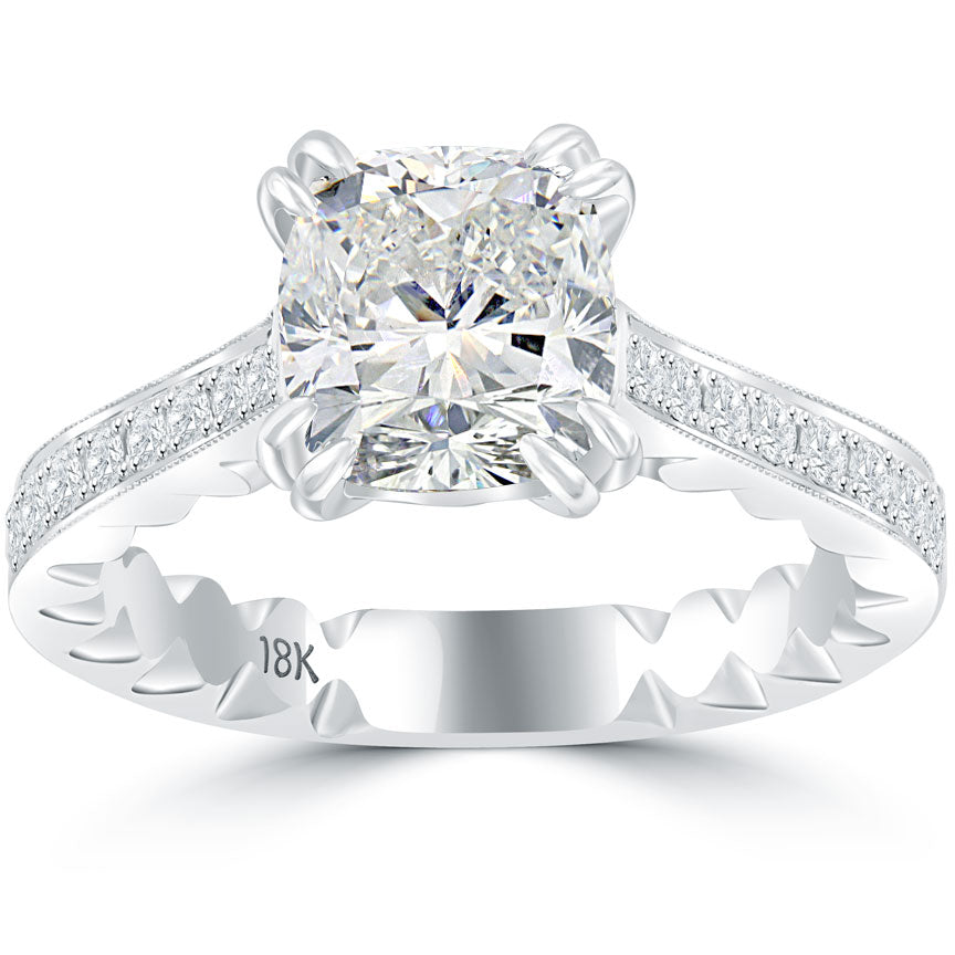 This is a gorgeous cushion cut diamond engagement ring, sure to put a smile on the face of your future bride. The mesmerizing 2.01 ctw cushion cut center diamond is F-SI3 in color and clarity, and is held securely in place by 4 sturdy double prongs. The band of this lovely ring is adorned with 0.40 ctw of micro pave set diamonds to the sides of the center stone, as well on the gallery. This piece is lavishly crafted in 18k white gold, and would be the perfect engagement ring for your perfect other half.