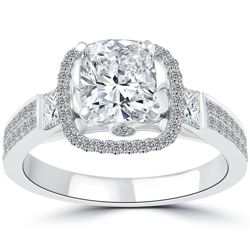 Here is a divinely stylish cushion cut diamond engagement ring. At the center of this spectacular piece is a dazzling 1.56 ctw cushion cut diamond that is F-VS2 in color and clarity. Glittering pave diamonds form a halo around the center diamond, complimenting it perfectly. The ring is further adorned with a sparkling princess cut diamond on either side of the center stone. The elegant band is also lined with 2 rows of diamonds in a micro pave setting. This amazing engagement ring is set in 18k white gold and would be the perfect gift for any bride to be.